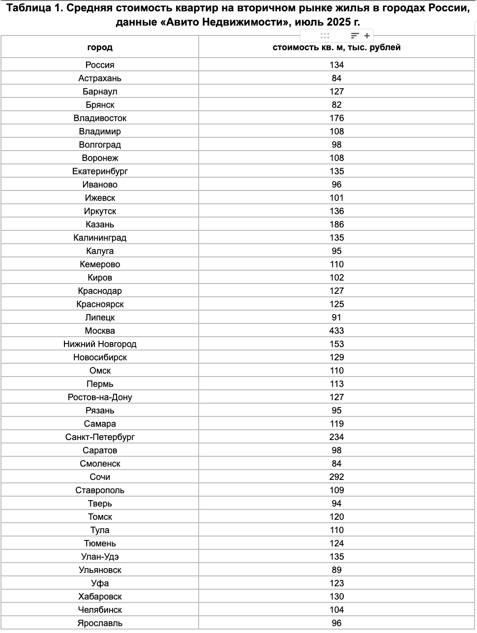 По итогам июля 2025 года дешевле всего купить квартиру на вторичном рынке можно было в Брянске (4,4 млн рублей), Смоленске (4,5 млн рублей), Астрахани и Ульяновске (по 4,6 млн рублей), Липецке (4,7 млн рублей), Рязани, Калуге и Твери (по 5 млн рублей), Иванове, Ижевске, Волгограде и Ярославле (по 5,1 млн рублей). Самые высокие средние цены в июле 2025 года аналитики платформы отметили в Москве (37,1 млн рублей), Сочи (14,3 млн рублей), Санкт-Петербурге (13,8 млн рублей), Казани (10 млн рублей) и Владивостоке (8,3 млн рублей). Информация по другим городам, а также стоимость квадратного метра представлена в таблице 1.